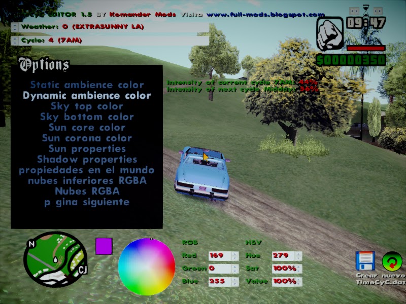 inician una nueva partida y escriben como si fuera un truco xD ponen “TIMECYC” y les saldra un menú con muchas opciones hay pueden editar su propio TimeCyC a su gusto 😀 espero les sirva 😀